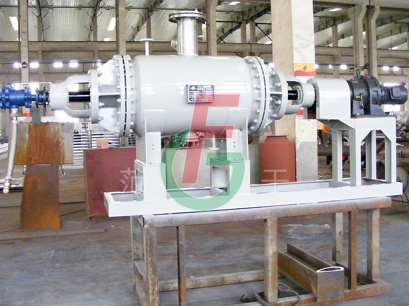 耙式真空干燥机是利用物料中的水份在真空状态下沸点降低的特点来进行干燥的设备。该设备用蒸汽夹套间接加热,水份受热蒸发并被及时抽除。在干燥机壳体内部,耙齿通过传动轴带动,耙齿端与轴线设计有一定角度,主轴通过正向反向转动使物料沿轴向移动以利于干燥及出料。