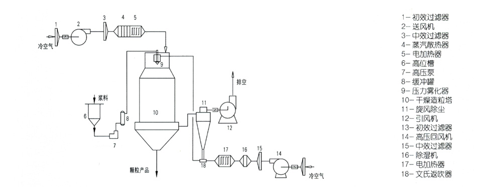 它的雾化机理是用高压泵使液体获得高压(1-10Mpa),高压液体通过喷嘴时,将压力转化为动能而高速喷出时分散成液滴。这种雾化方式有以下优点:雾化动力小;操作、检修、更换简便;可获得较大颗粒等等。它的缺点是:需要高压泵,喷嘴容易堵塞,料液需严格过滤;喷嘴磨损大;高黏度物料不易雾化。