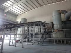 由常州市范群干燥设备有限公司生产的2万吨/年白碳黑干燥装置日前在浙江横店通过验收,该装置由燃煤热风系统、加料系统、闪蒸干燥系统、布袋收尘系统、自动包装系统等组成。针对白碳黑滤饼含水量高、耐温高及产品比重小的特点,热源采用了间接式燃煤热风炉,热风温度高达500℃以上,进料系统采用皮带输送和螺旋加料相结合,干燥主机采用直径2米的闪蒸干燥机,直接配套布袋除尘器收集产品,并由自动包装机完成产品包装。整套装置自动化程度高,在人员配置及吨耗等重要指标达到了设计水平。